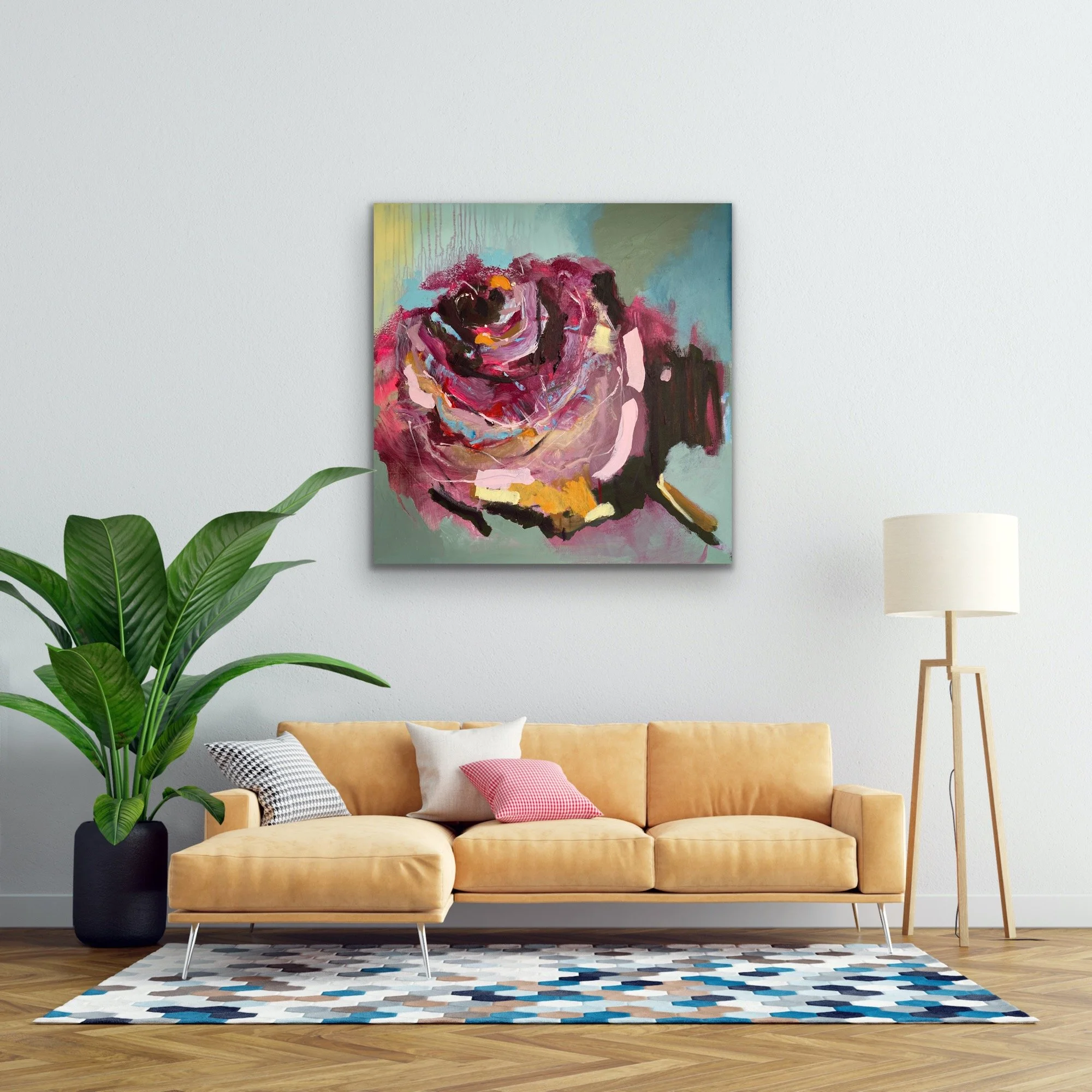 The peony is fragmented into a graphic abstract painting. Each layer takes the viewer on a journey to the outer and closest layer which is stronger and more powerful. Along this pathway, the paint is disturbed at intervals to emphasise the troubled way.